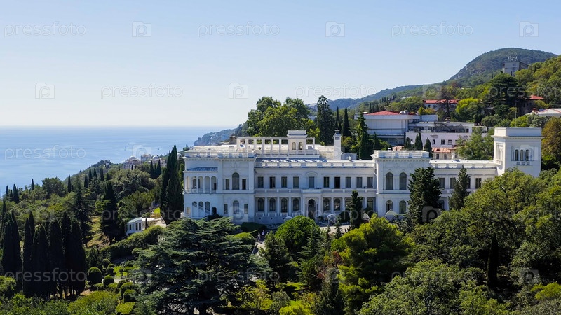 Ливадийский дворец - расположен на побережье Черного моря в деревне Ливадия, Ялтинская область Крыма, вид с воздуха