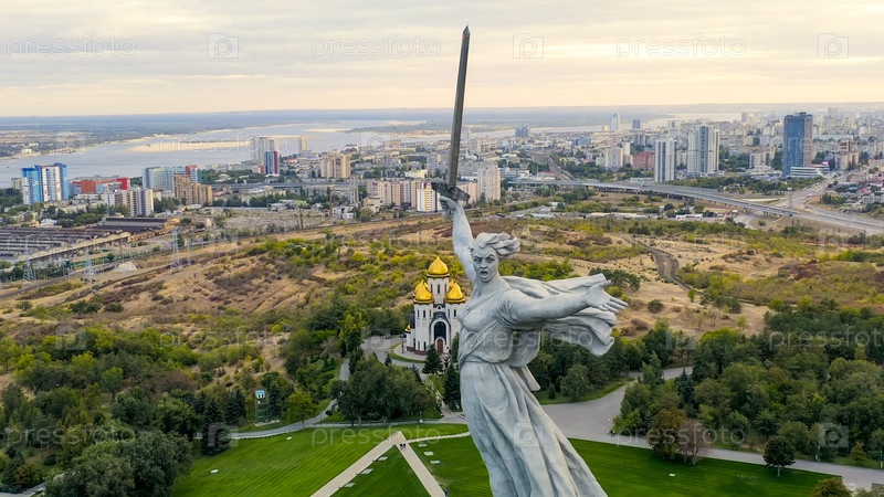 Волгоград, Россия. вечерний вид скульптуры 'Родина зовет!' на Мамаевском кургане в Волгограде. облачная погода, взгляд из воздуха
