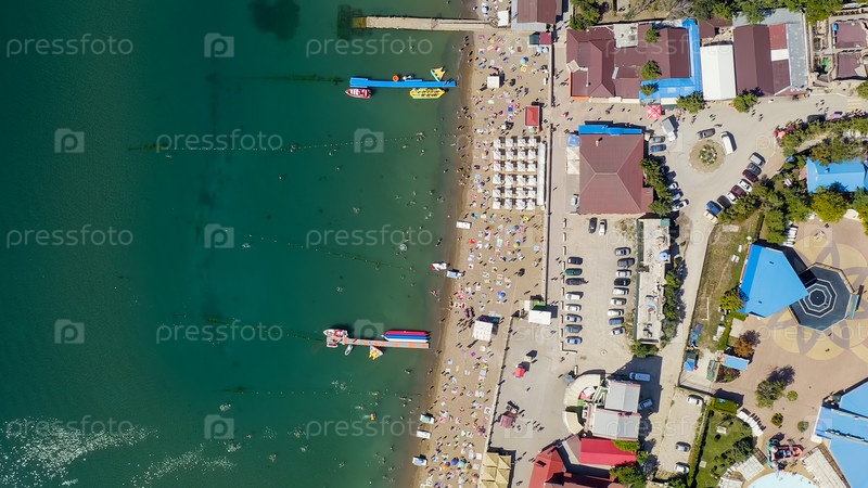 Судак, Крым. набережная Судак. побережье Черного моря с пляжами и людьми, взгляд из воздуха, голова над выстрелом