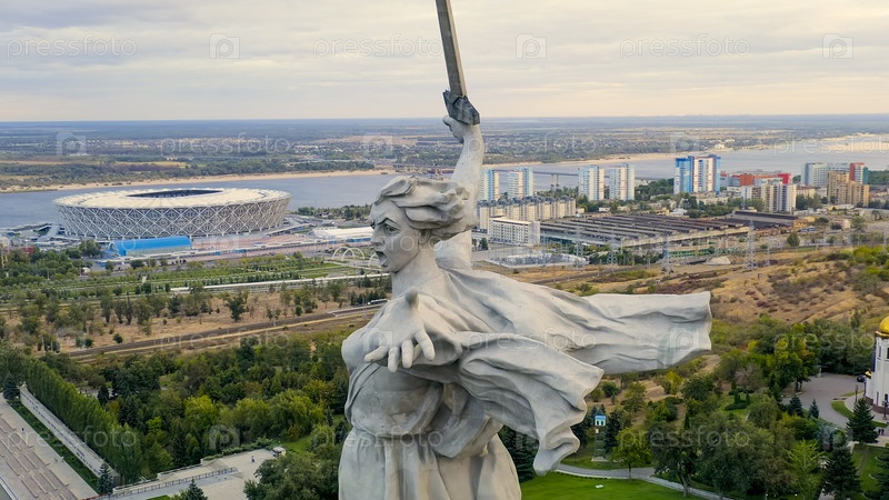 Волгоград, Россия. вечерний вид скульптуры 'Родина зовет!' на Мамаевском кургане в Волгограде. облачная погода, взгляд из воздуха