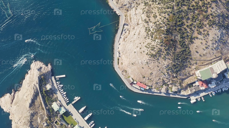 Балаклавская бухта с яхтами и рекреационными лодками, Aerial View, Head Over Shot
