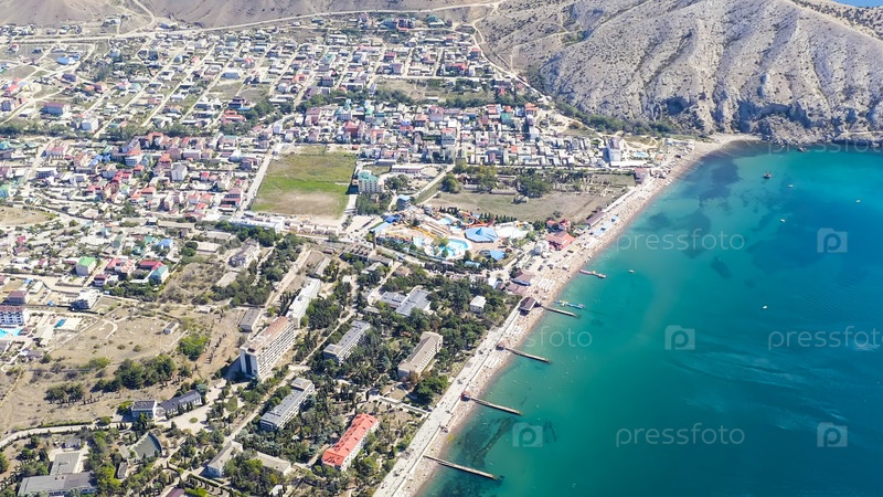 Судак, Крым. набережная Судака. побережье Черного моря с пляжами, Aerial View Sud