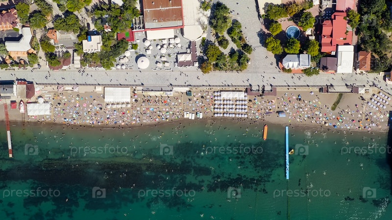 Судак, Крым. набережная Судак. побережье Черного моря с пляжами и людьми, взгляд из воздуха, голова над выстрелом