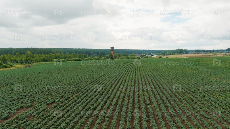 Россия, Урал. Летающий над полями. ряды картофеля. старая красная кирпичная водная башня, вид с воздуха
