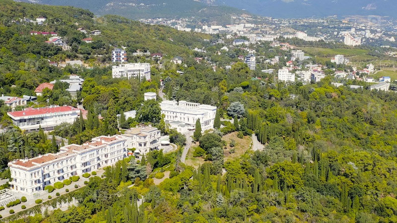 Ливадийский дворец - расположен на побережье Черного моря в деревне Ливадия, Ялтинская область Крыма, вид с воздуха
