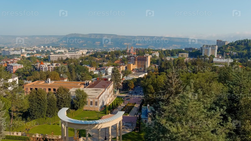 Кисловодск, Россия. Каскадная лестница. Чистое солнечное утро. Лето, вид с воздуха