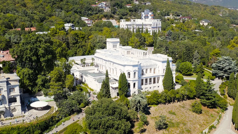 Ливадийский дворец - расположен на побережье Черного моря в деревне Ливадия, Ялтинская область Крыма, вид с воздуха