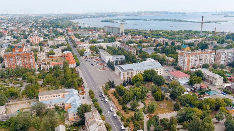 Сизран, Россия 21 августа 2021: Администрация городского округа Сызран. Драматический театр Syzran. Центральная площадь, вид с воздуха