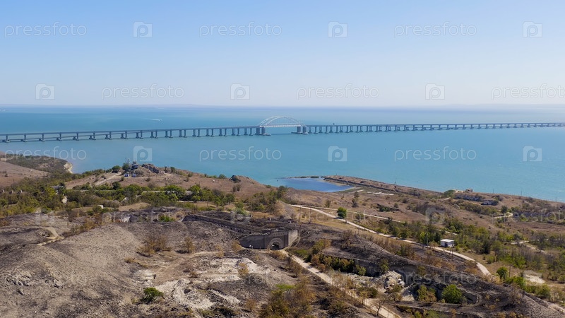 Керчь, Крым. Вид на новый крымский мост. Керченская крепость. Чистая погода, вид с воздуха