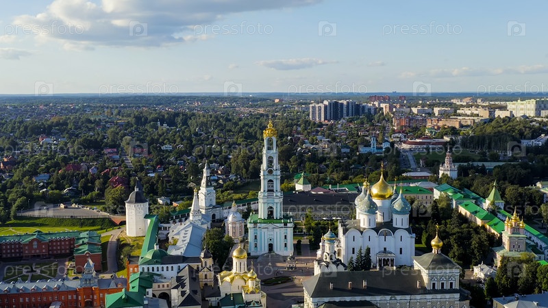 Сергиев Посад, Россия.Троицко-Сергийская лавра - крупнейший мужской монастырь Русской православной церкви с долгой историей.Расположен в центре Сергиева Посады.Солнечный свет, взгляд из воздуха