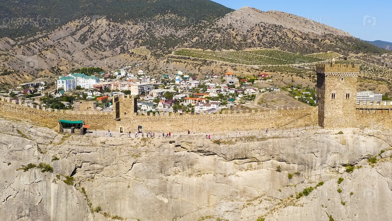 Судак, Крым. Генуэзская крепость в Судаке. Средневековая крепость площадью более 30 гектаров. На побережье Черного моря вид с воздуха