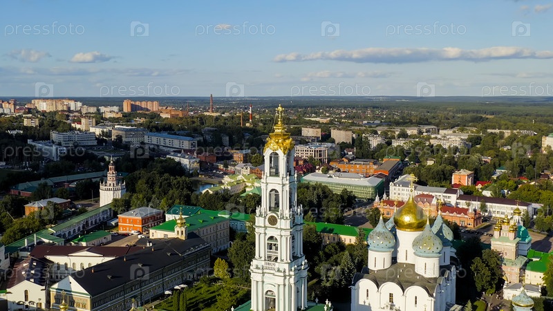 Сергиев Посад, Россия.Троицко-Сергийская лавра - крупнейший мужской монастырь Русской православной церкви с долгой историей.Расположен в центре Сергиева Посады.Солнечный свет, взгляд из воздуха
