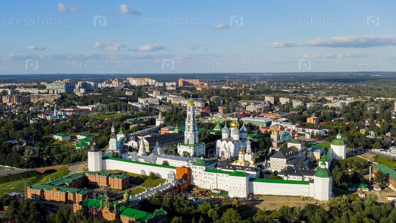 Сергиев Посад, Россия.Троицко-Сергийская лавра - крупнейший мужской монастырь Русской православной церкви с долгой историей.Расположен в центре Сергиева Посады.Солнечный свет, взгляд из воздуха
