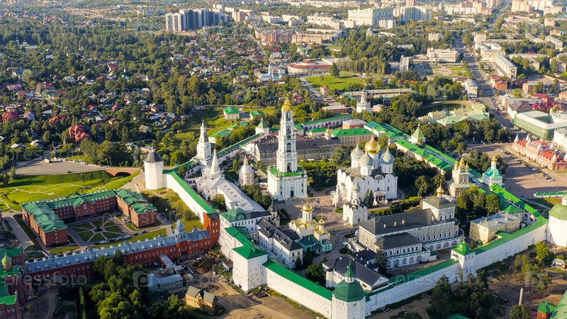 Сергиев Посад, Россия.Троицко-Сергийская лавра - крупнейший мужской монастырь Русской православной церкви с долгой историей.Расположен в центре Сергиева Посады.Солнечный свет, взгляд из воздуха