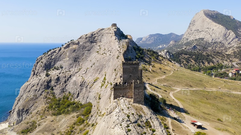 Судак, Крым. Генуэзская крепость в Судаке. Средневековая крепость площадью более 30 гектаров. На побережье Черного моря вид с воздуха