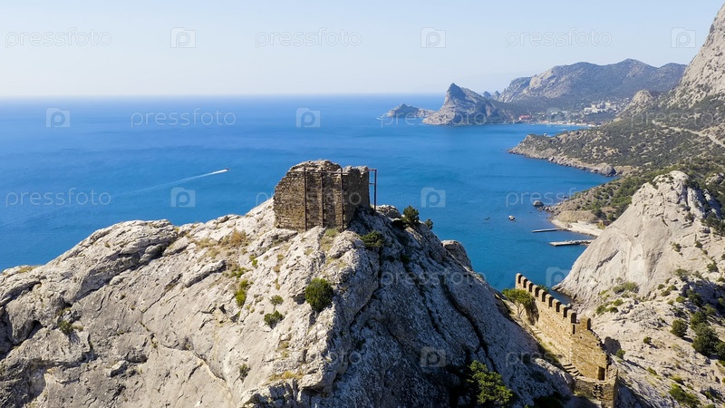 Судак, Крым. Генуэзская крепость в Судаке. Средневековая крепость площадью более 30 гектаров. На побережье Черного моря вид с воздуха