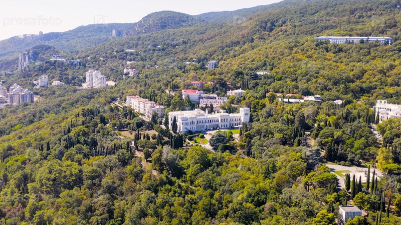 Ливадийский дворец - расположен на побережье Черного моря в деревне Ливадия, Ялтинская область Крыма, вид с воздуха