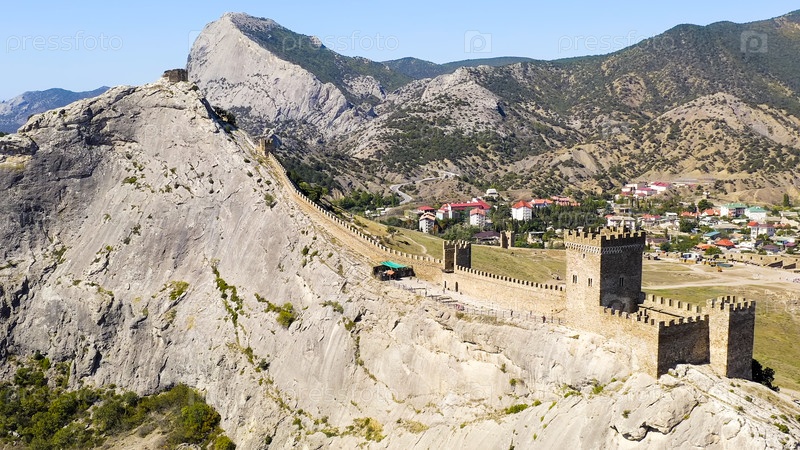 Судак, Крым. Генуэзская крепость в Судаке. Средневековая крепость площадью более 30 гектаров. На побережье Черного моря вид с воздуха