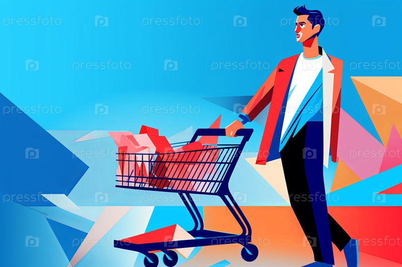 Потребитель с корзиной покупок супермаркета, твердый светло-синий фон, стиль иллюстраций вдохновленный графическим дизайном, цветные формы