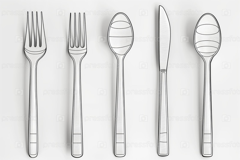 Черно-белый минималистический эскиз, показывающий различные конструкции столовых приборов, включая вилки, ножи и ложки