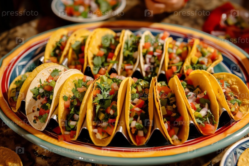 Яркий дисплей мексиканских тако, заполненных свежими ингредиентами, включая авокадо, помидоры, лук и салат на красочной тарелке