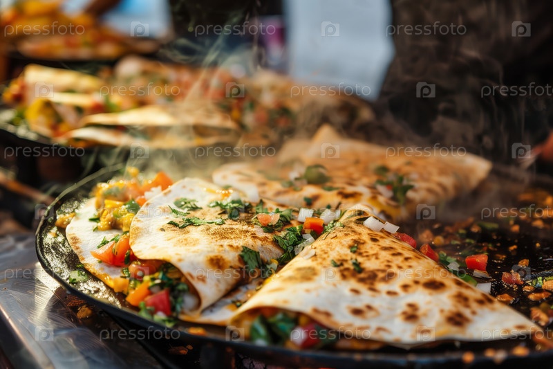 Уличная квесадилла со свежими ингредиентами, захватывающая яркую и шумную атмосферу открытого рынка