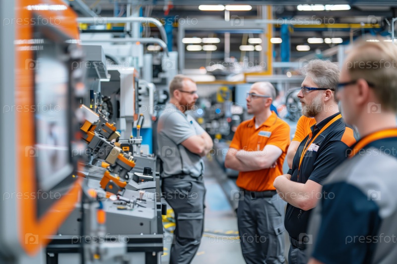 Группа инженеров участвует в командной работе, обсуждая технические детали сегодняшнего рабочего пространства