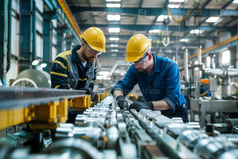 Два инженера в шапке безопасности работают вместе над оборудованием на оживленном промышленном объекте, обеспечивая точность и эффективность во время работы