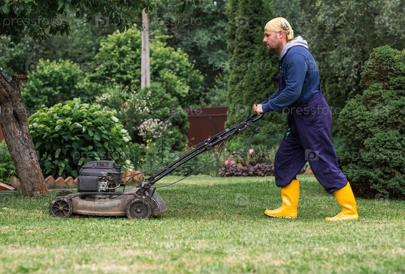 Концепция садоводства и деревенской жизни. Человек-косилка косит траву на заднем дворе. Сельскохозяйственное оборудование для содержания сада. Баннер