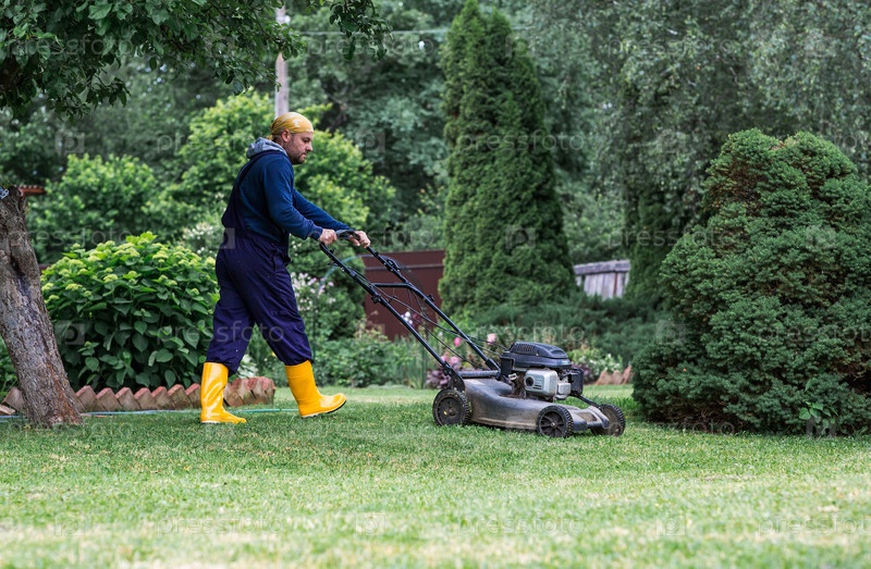 Концепция садоводства и деревенской жизни. Человек-косилка косит траву на заднем дворе. Сельскохозяйственное оборудование для содержания сада. Баннер
