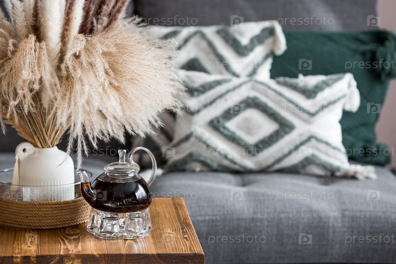 Уютная домашняя осенняя композиция. натюрморт. букет сухой травы панпаса в вазе и чайник на столе в гостиной