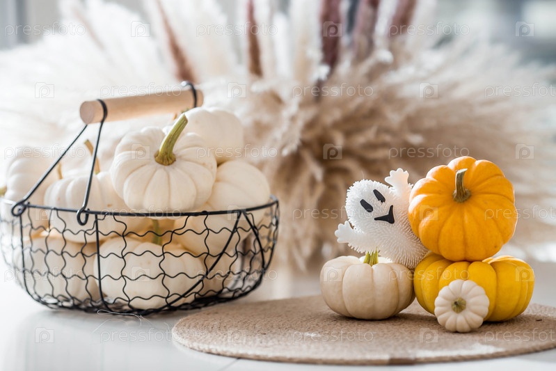 Осеннее украшение на Хэллоуин.Красивый призрак и тыквы.Баннер, фон для празднования Хеллоуина