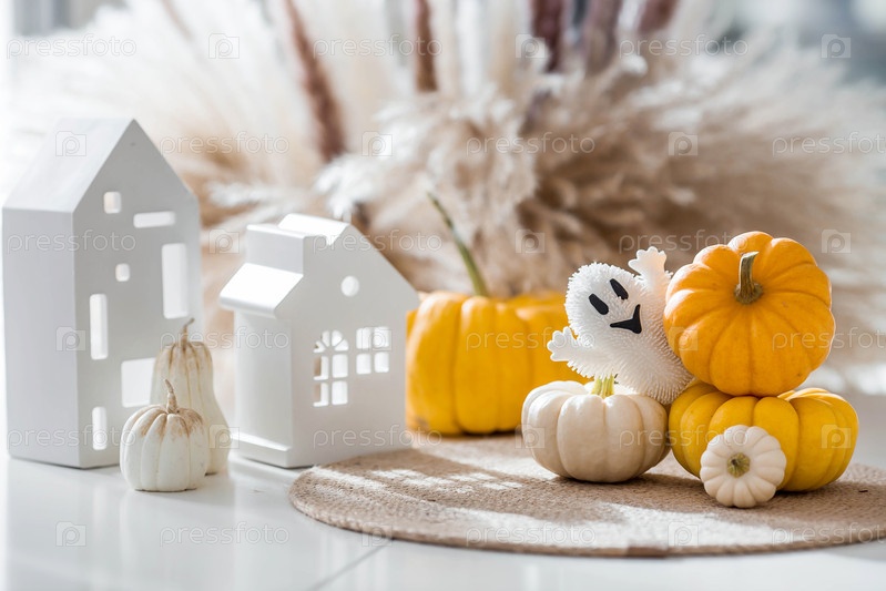 Осеннее украшение на Хэллоуин.Красивый призрак, белые дома и тыквы.Баннер, фон для празднования Хеллоуина