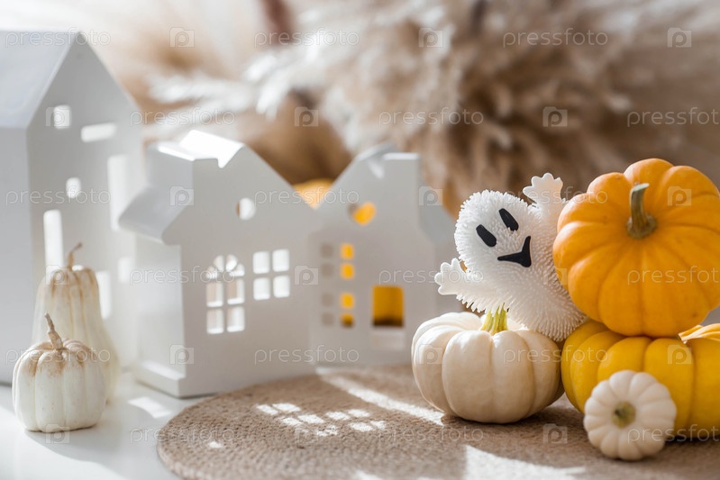 Осеннее украшение на Хэллоуин.Красивый призрак, белые дома и тыквы.Баннер, фон для празднования Хеллоуина