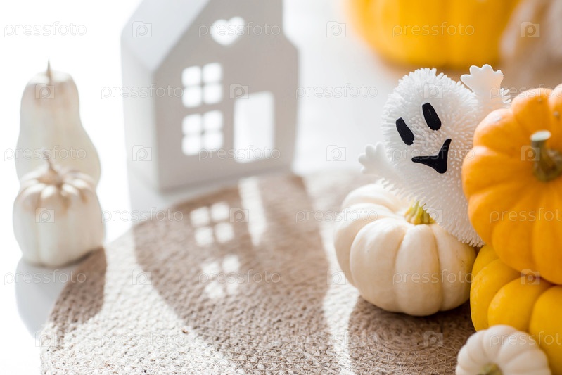 Осеннее украшение на Хэллоуин.Красивый призрак, белые дома и тыквы.Баннер, фон для празднования Хеллоуина