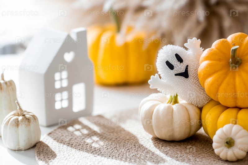 Осеннее украшение на Хэллоуин.Красивый призрак, белые дома и тыквы.Баннер, фон для празднования Хеллоуина
