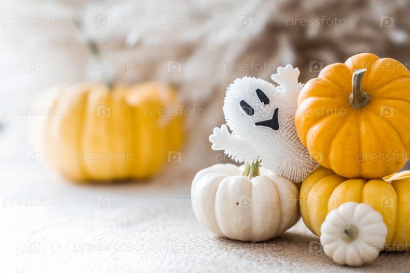 Осеннее украшение на Хэллоуин.Красивый призрак и тыквы.Баннер, фон для празднования Хеллоуина