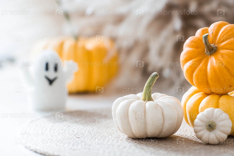 Осеннее украшение на Хэллоуин.Красивый призрак и тыквы.Баннер, фон для празднования Хеллоуина
