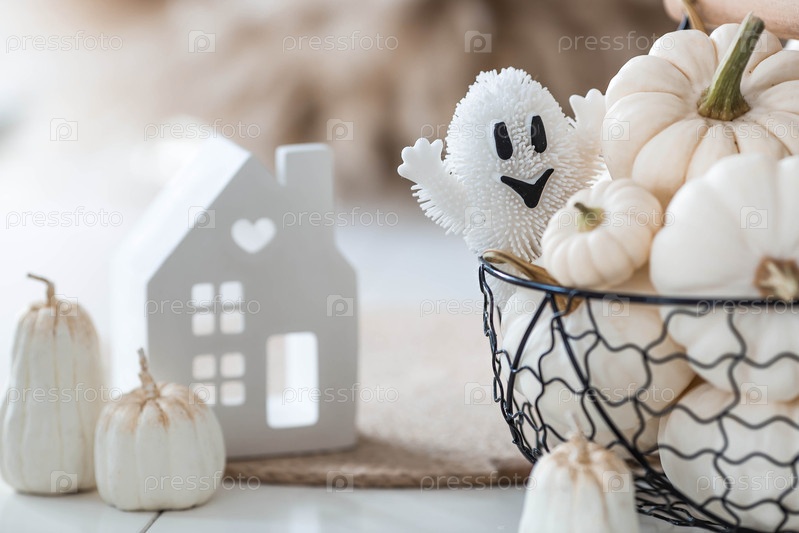 Осеннее украшение на Хэллоуин.Красивый призрак, белые дома и тыквы.Баннер, фон для празднования Хеллоуина