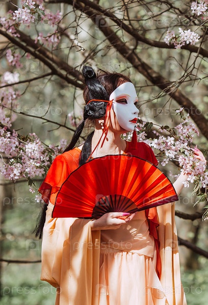Женщина в японской маске, традиционной одежде и вентиляторе в руке, окруженная вишневыми цветами на весеннем саду.Портрет символизирует традиции и культуру японского народа