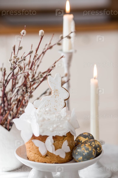 Счастливая Пасха 2026. стильная пасхальная натюрморт. пасхальный торт с белым кроликом и бабочками, пасхальные яйца со золотом, свечи и ветки ивы на белом столе