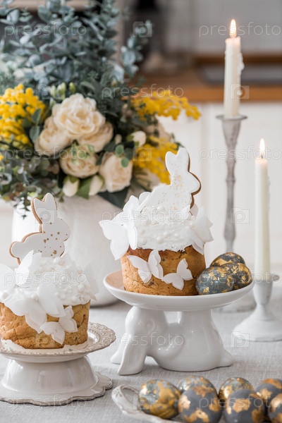 Счастливая Пасха 2026. стильная пасхальная натюрморт. пасхальный торт с белым кроликом и бабочками, пасхальные яйца со золотом, свечи и весенний букет цветов на столе