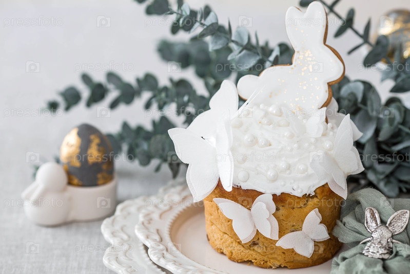 Стильный пасхальный натюрморт. Пасхальный торт с белым кроликом и бабочками, пасхальные яйца со золотыми веточками эвкалипта на белом кухонном столе. Счастливого Пасхи 2026