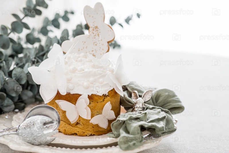 Стильный пасхальный натюрморт. Пасхальный торт с белым кроликом, бабочками и ветками эвкалипта на белом кухонном столе. Счастливого Пасхи 2026