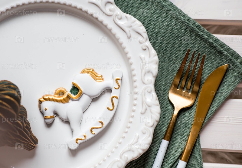 Концепция счастливого Рождества и Нового года 2026. настройка стола. стильные тарелки, салфетки и рождественские украшения на светлом фоне