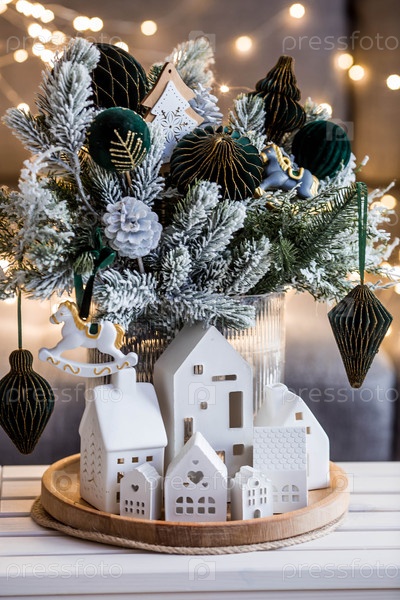 Концепция подготовки к Новому 2026 году.Бульвар с зелеными бумагами, лошадьми и белыми домами на столе в гостиной.Новогоднее украшение интерьера