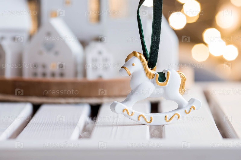 Концепция подготовки к Новому 2026 году. лошадь и белые дома на столе в гостиной. новогоднее украшение интерьера