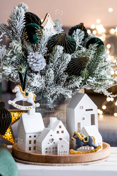 Концепция подготовки к Новому 2026 году.Бульвар с зелеными бумагами, лошадьми и белыми домами на столе в гостиной.Новогоднее украшение интерьера