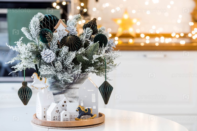 Концепция подготовки и украшения для Нового 2026 г. Кулинарный букет с зелеными игрушками, лошадьми и белыми домами на кухонном столе. Рождественские декорации в интерьере