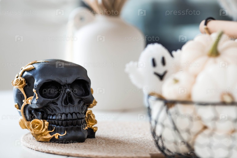 Чёрный череп, призрак и тыквы на столе. Баннер, фон для Хэллоуина или Дня мертвых
